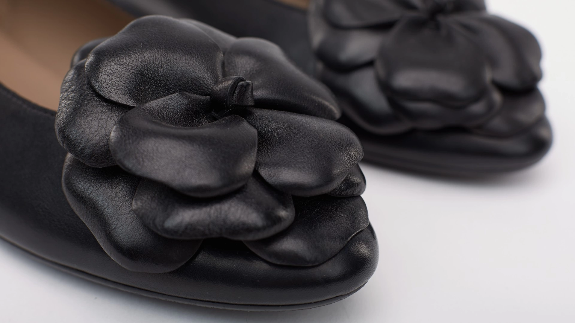 Balerinki w kolorze czarnym z ozdobnym kwiatem. Cholewka i ozdoba wykonana z naturalnej, licowej skóry, W środku skórzana futrówka i wkładka zapewniająca stopom idealny komfort. Miękka wkładka i podeszwa zwiększa uczucie wygody.