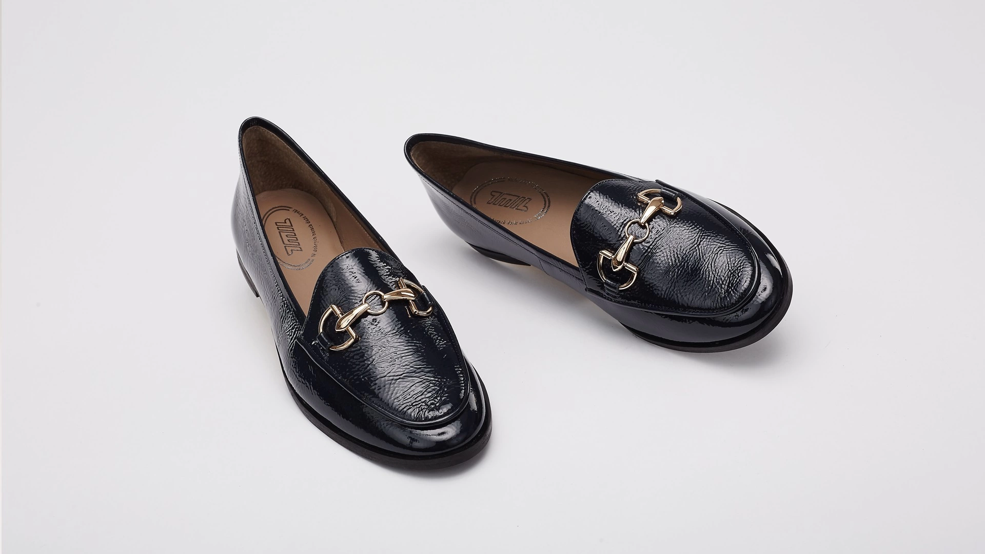 Mokasyny w kolorze granatowym ze złotą ozdobą. Cholewka wykonana z naturalnej, lakierowanej skóry. W środku skórzana futrówka i wkładka zapewniająca stopom idealny komfort. Miękka wkładka i podeszwa zwiększa uczucie wygody.